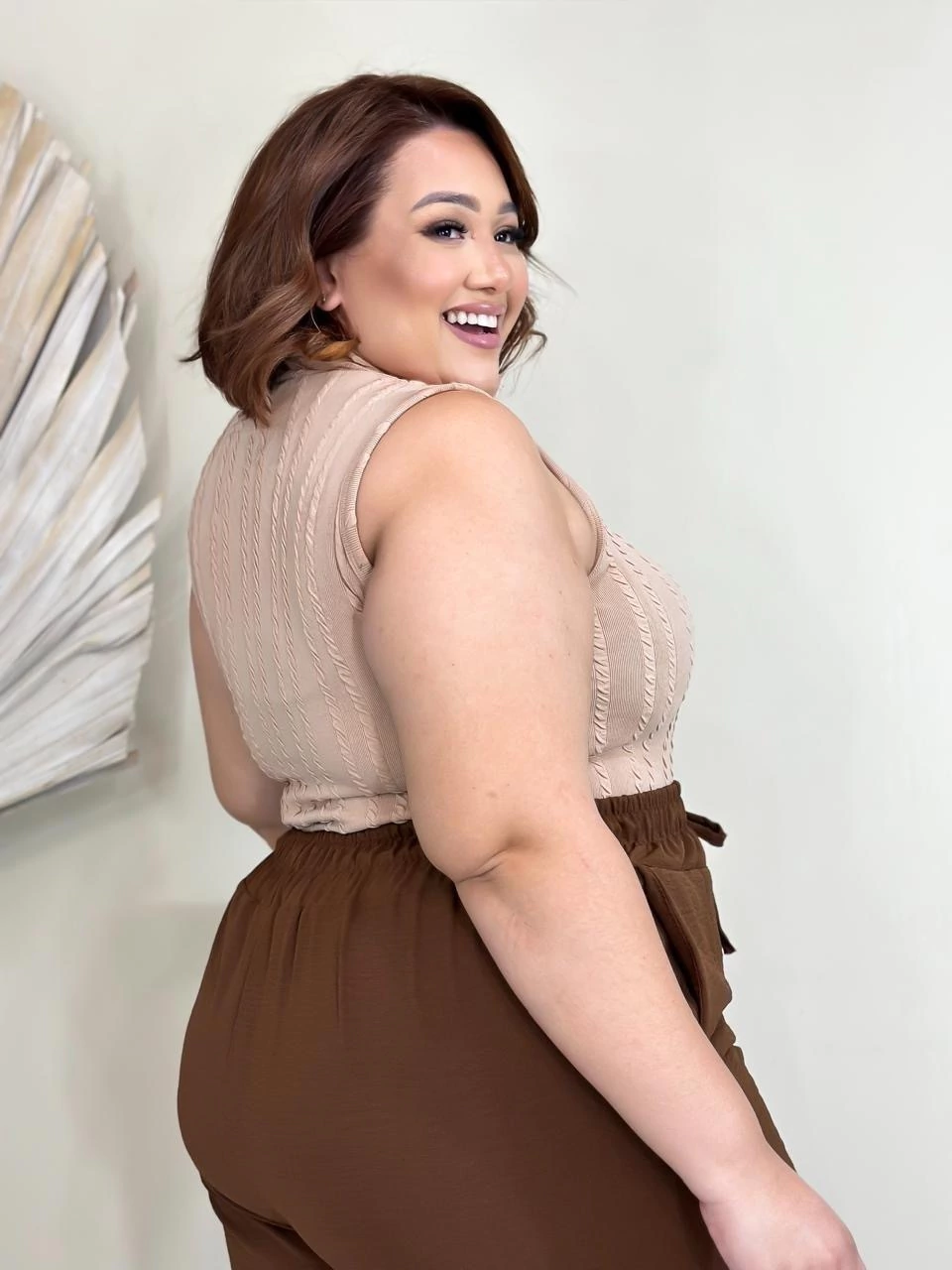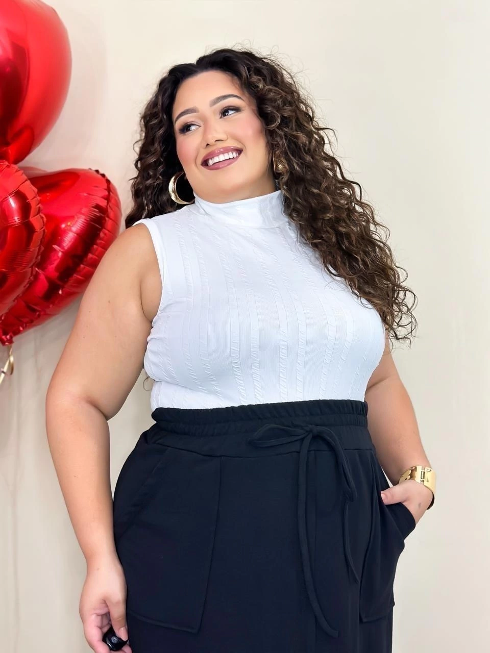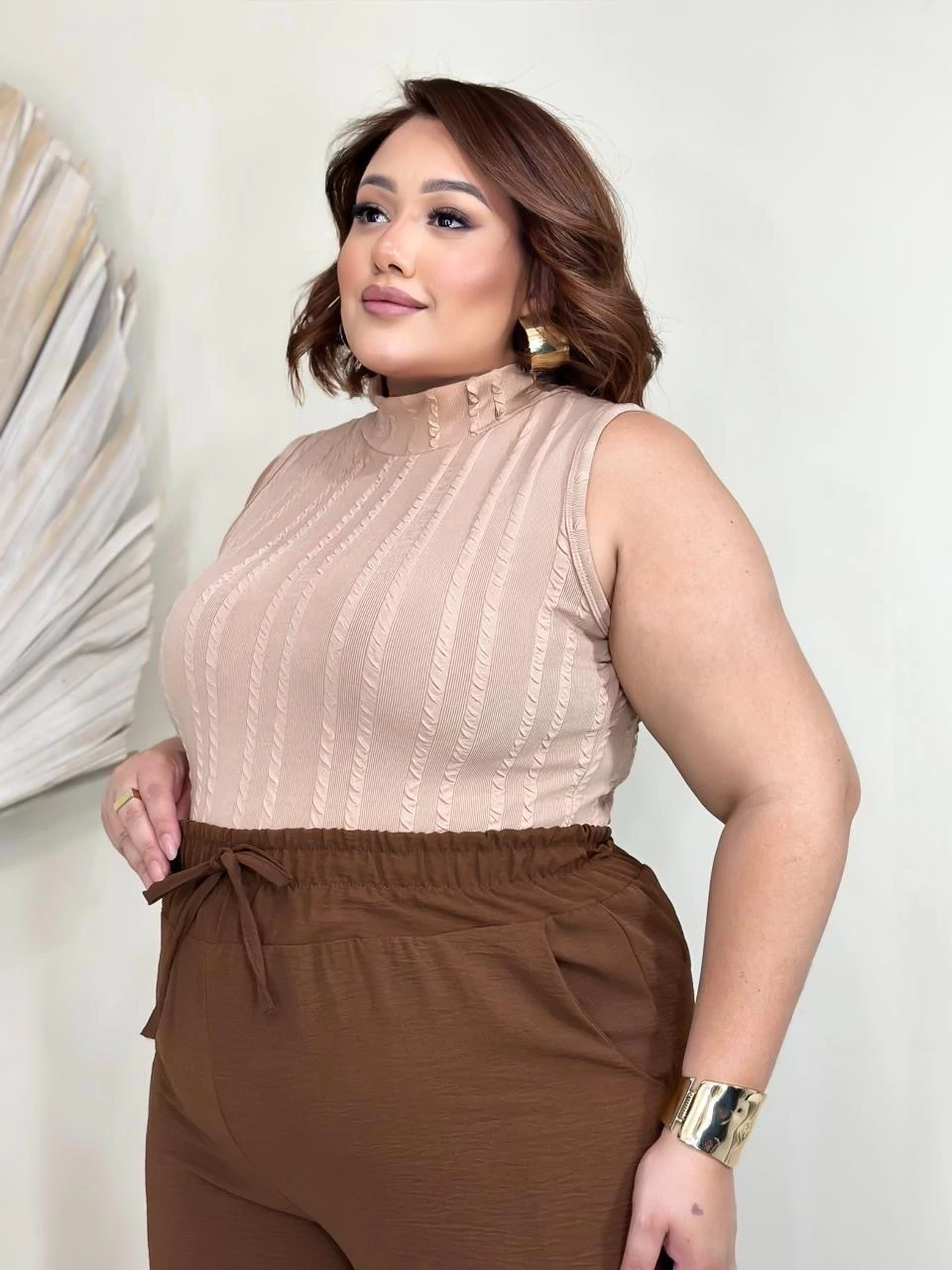 Blusa com tecido texturizado, possui gola, sem mangas.