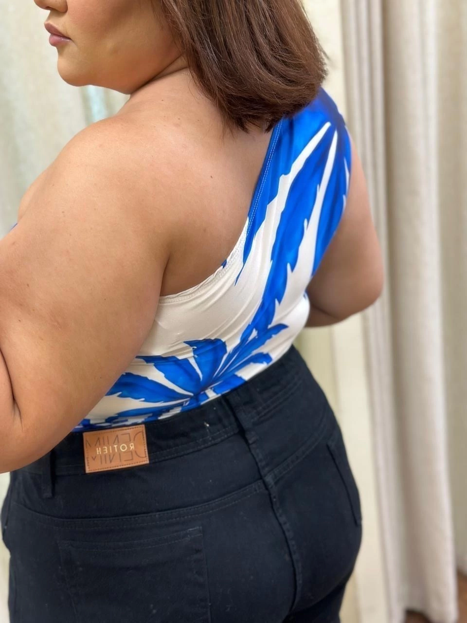 Body de ombro só com fivela na alça e fechamento embaixo.