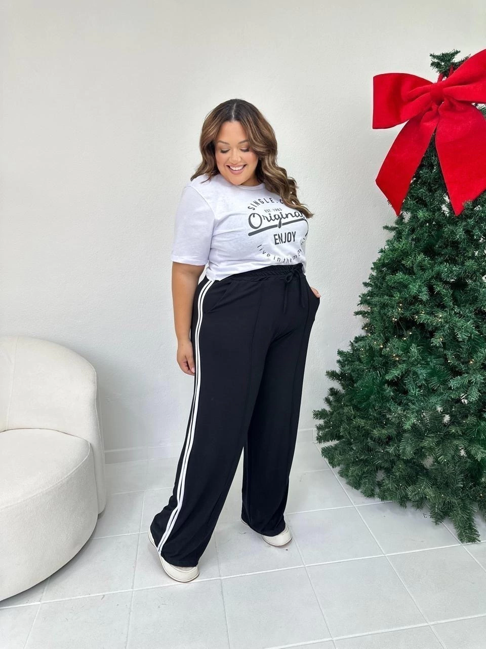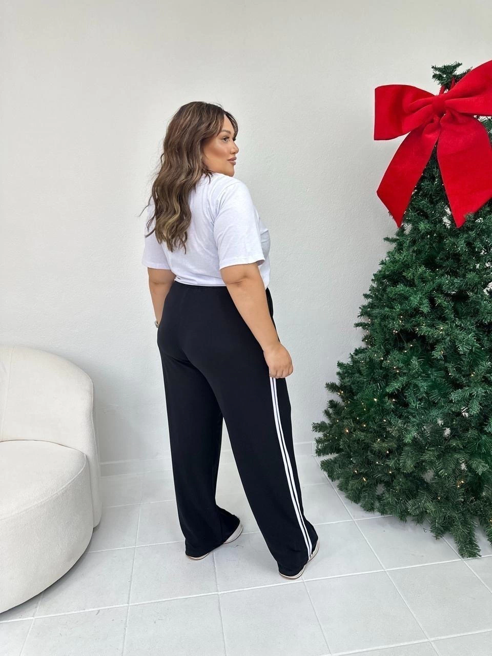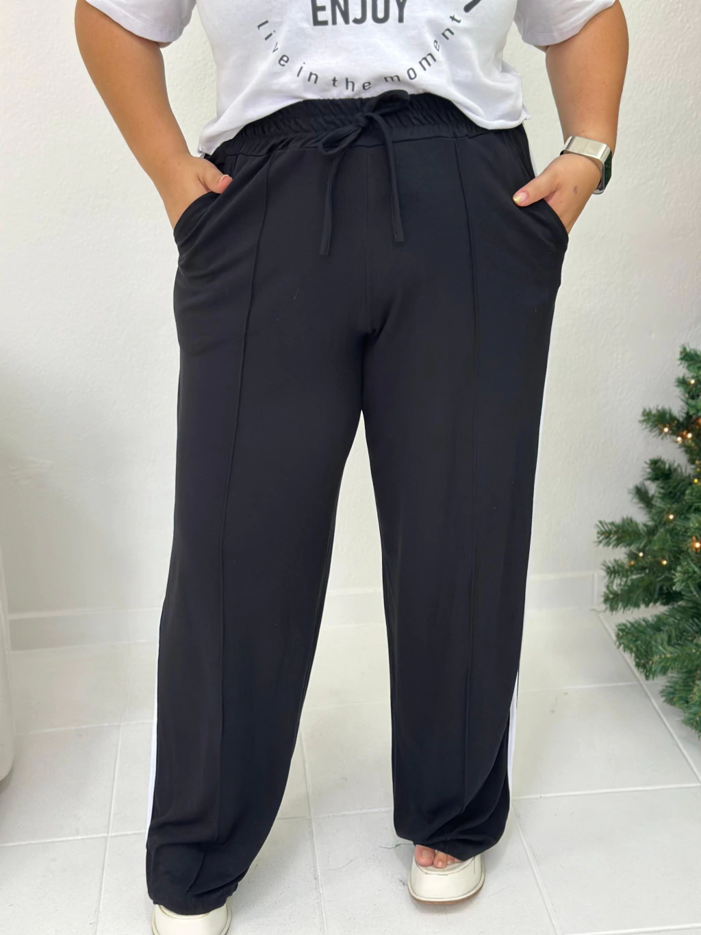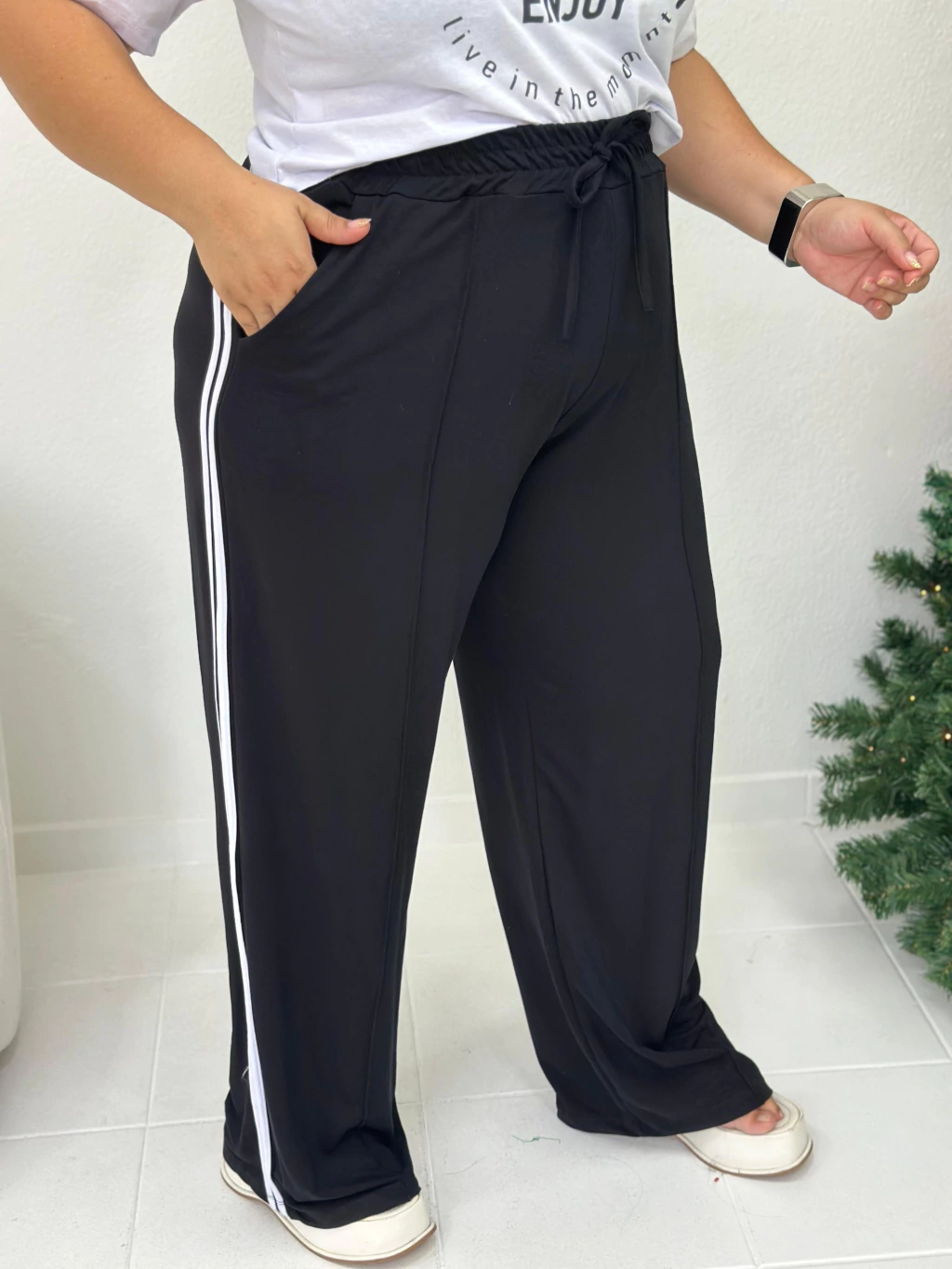 Calça Pantalona preta com listras laterais, possui elastico na cintura.