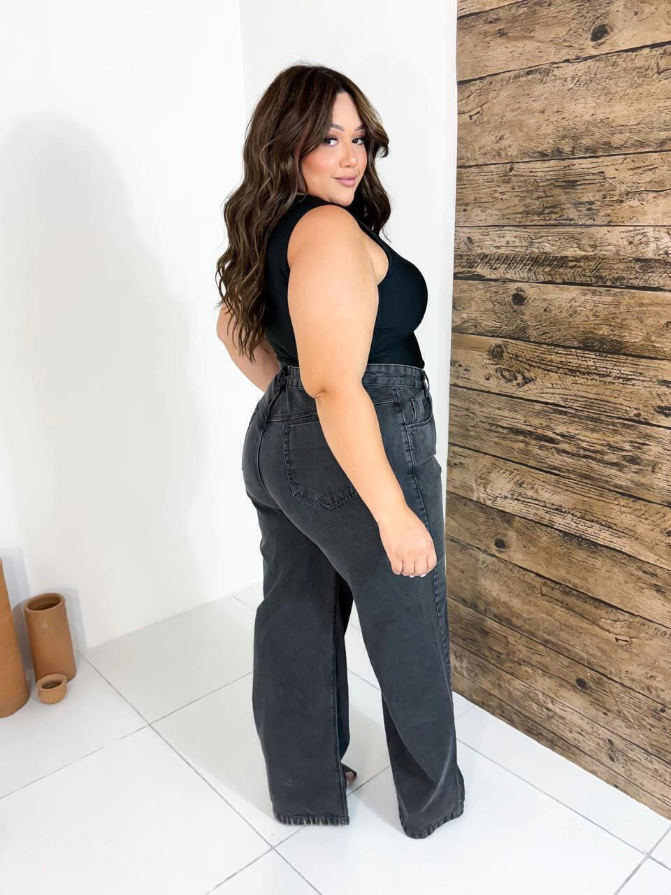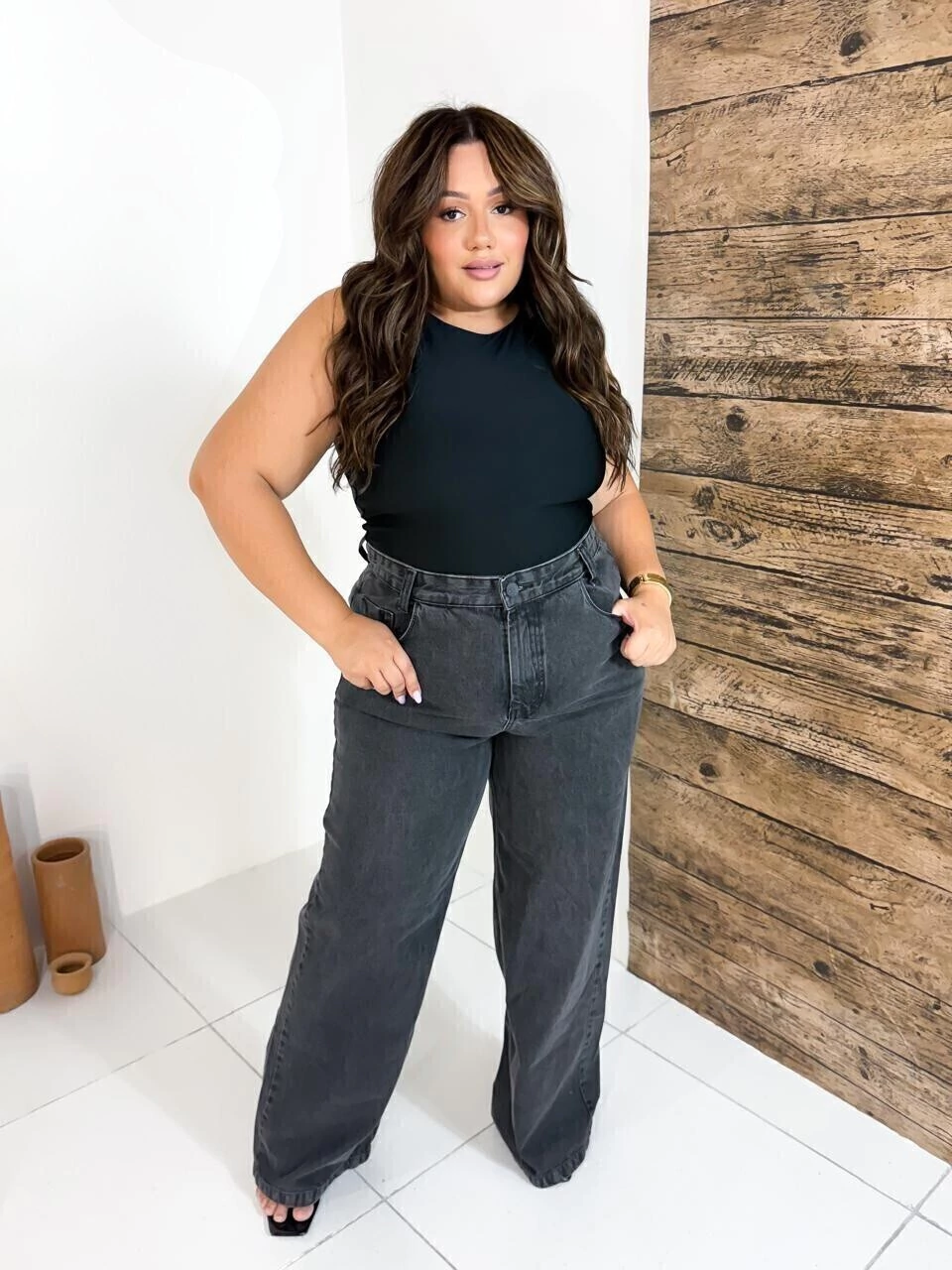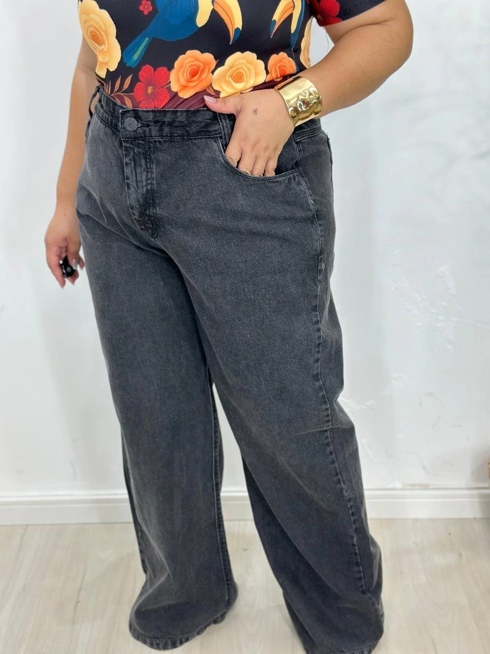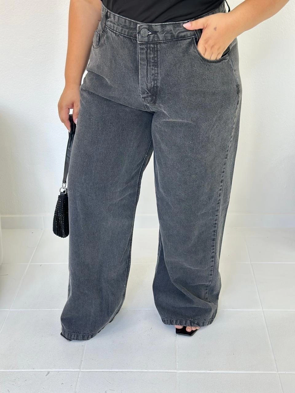 Calça Cargo Wide Leg Jeans Cinza, fechamento é frontal por zíper e botão.