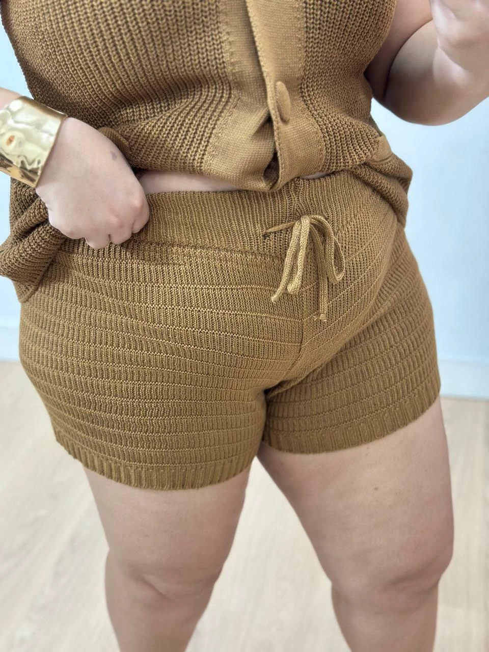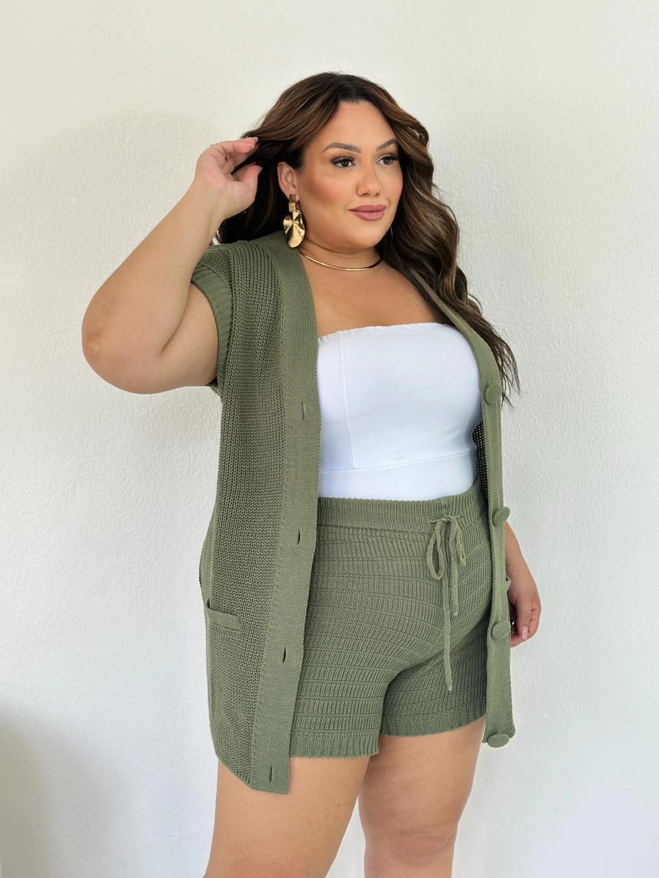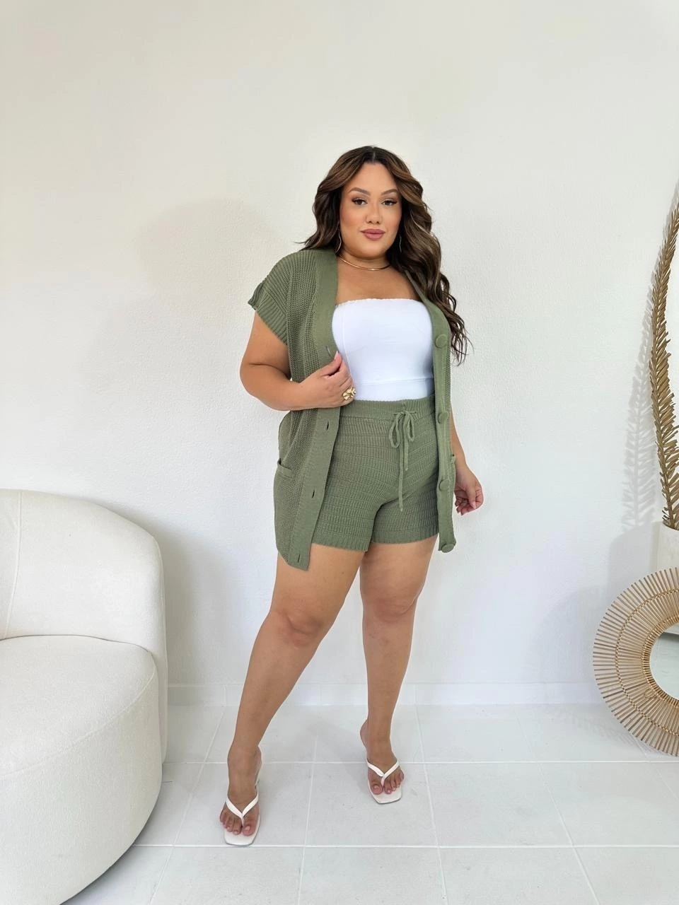 Conjunto de blusa estilo max colete com botões frontais e modelagem soltinha e um short de cintura alta com cordão ajustável.
