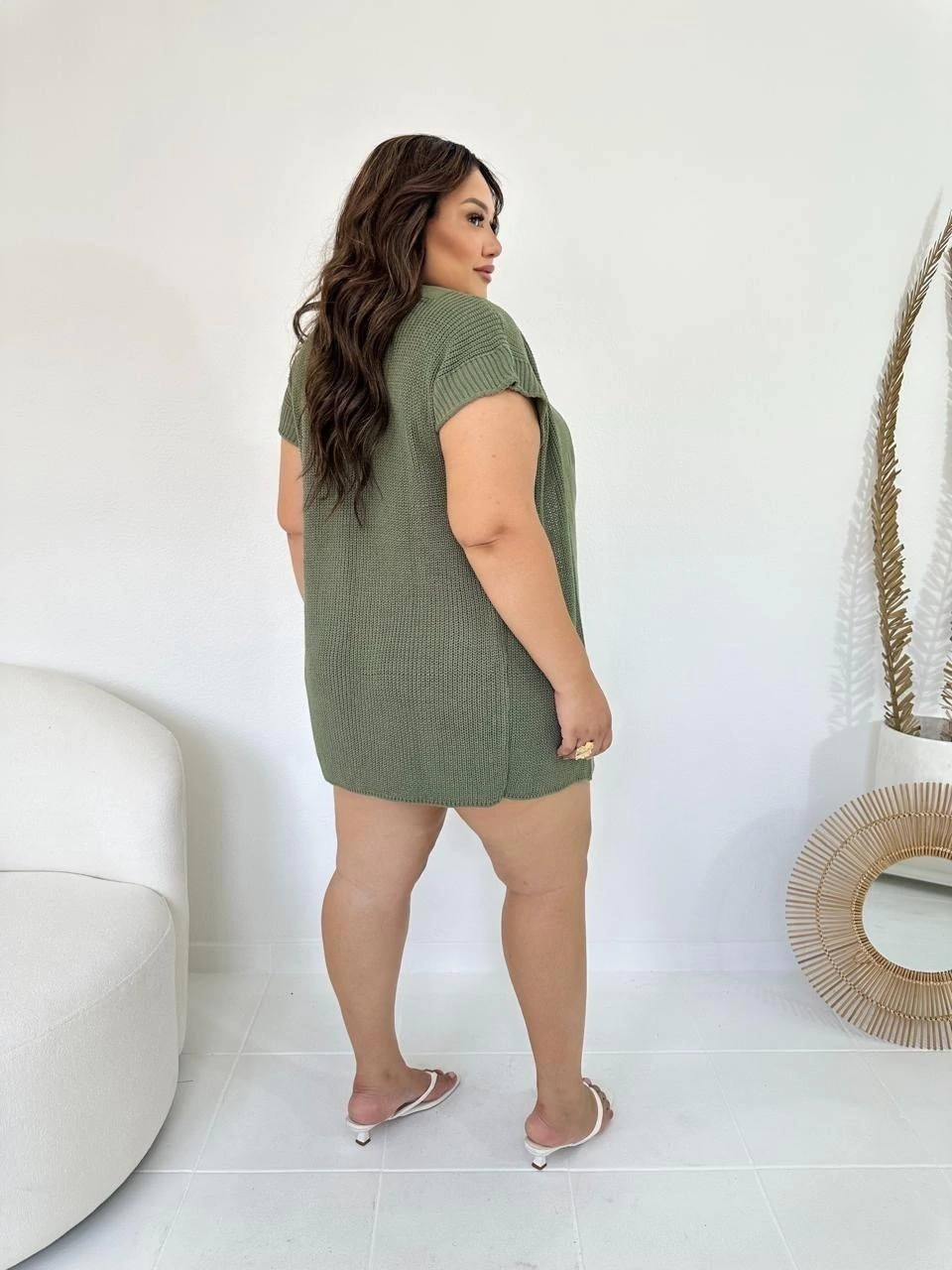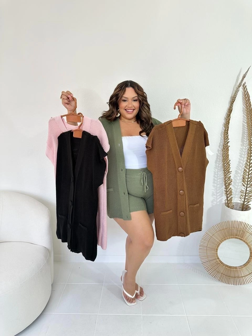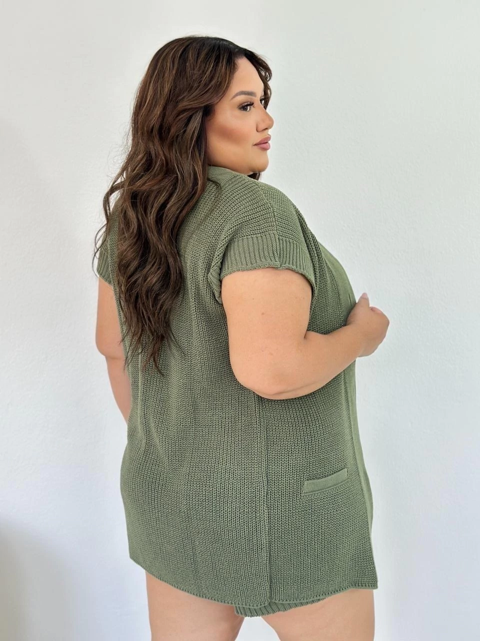 Conjunto de blusa estilo max colete com botões frontais e modelagem soltinha e um short de cintura alta com cordão ajustável.