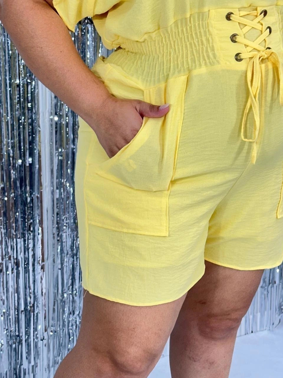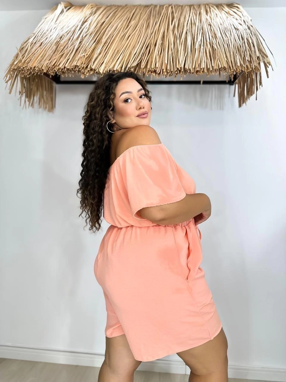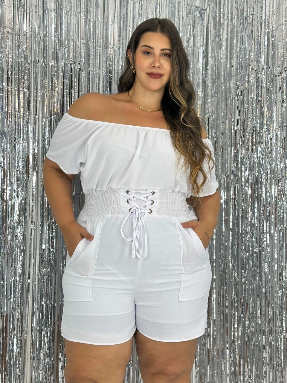 Macaquinho de manga com lastex e trançado na cintura. Possui bolsos laterais.