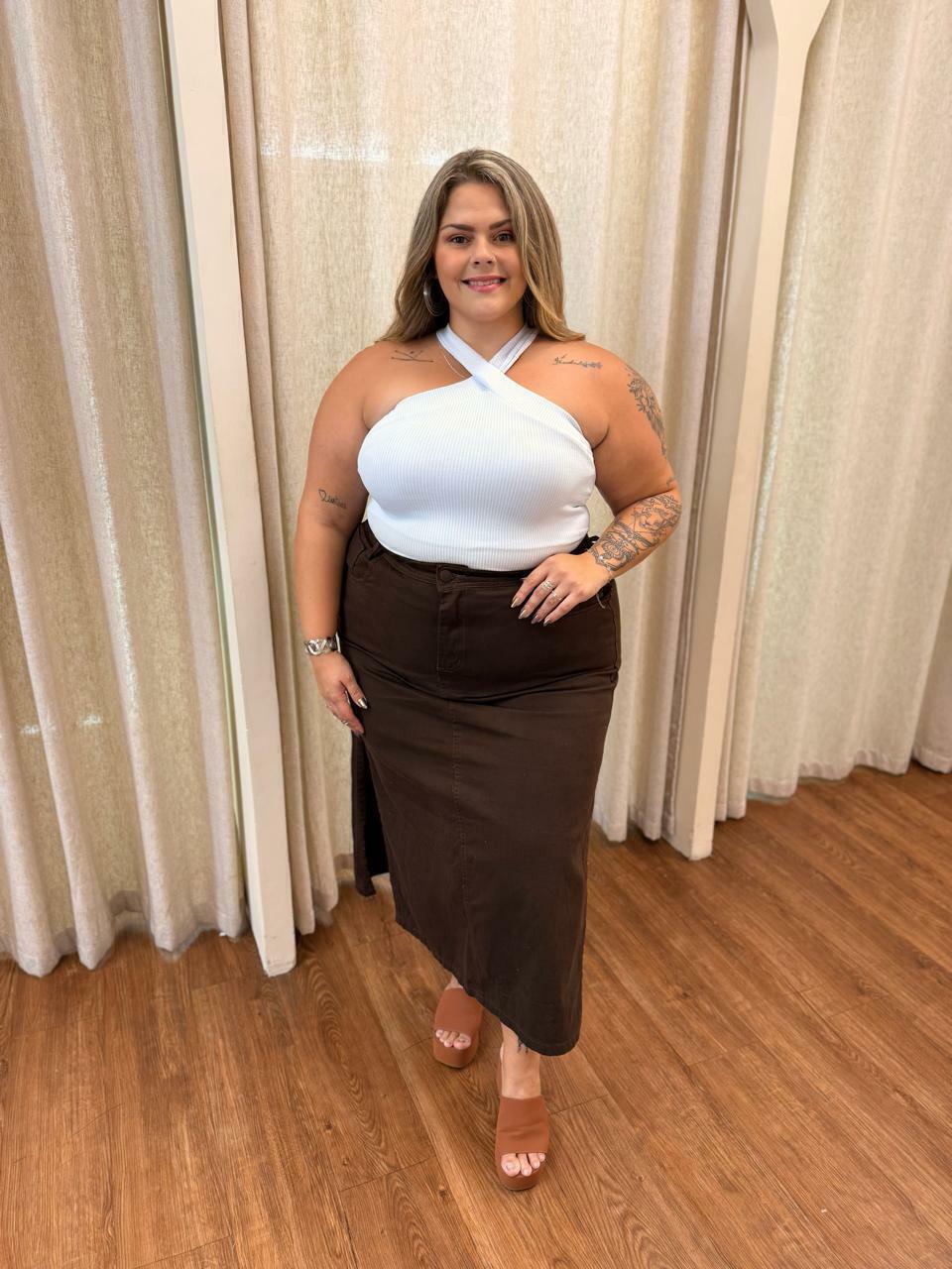 Saia midi em sarja, possui bolsos laterais e traseiros, botão frontal e zíper.