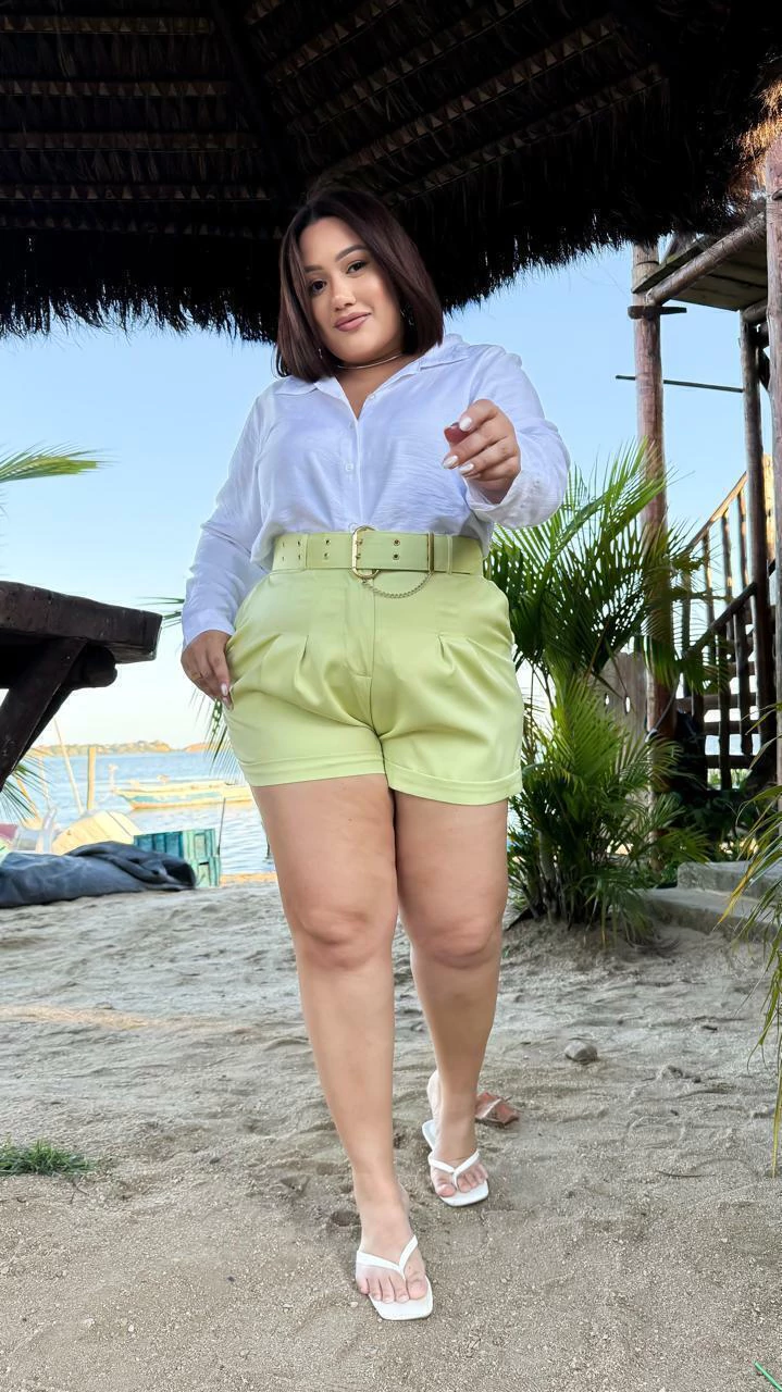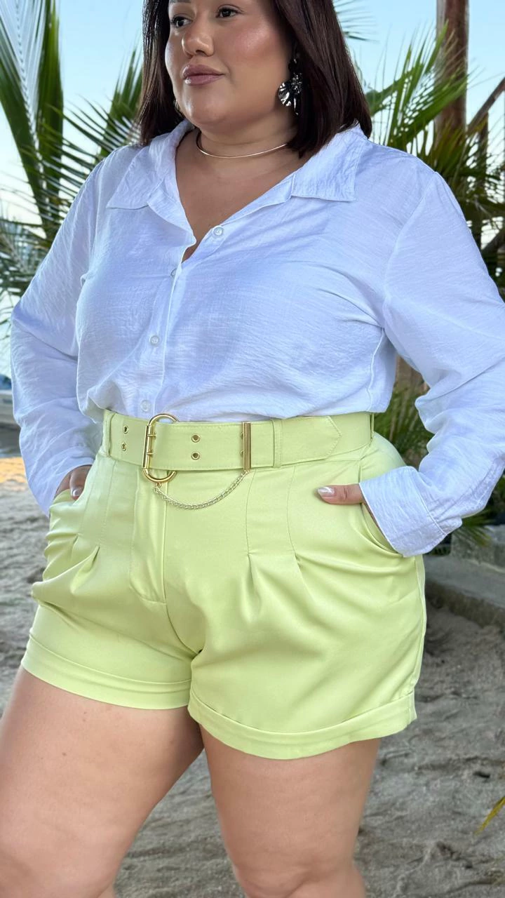 Short em tecido alfaiataria, possui bolsos laterais e botões na barra, cinto com detalhe dourado de corrente.