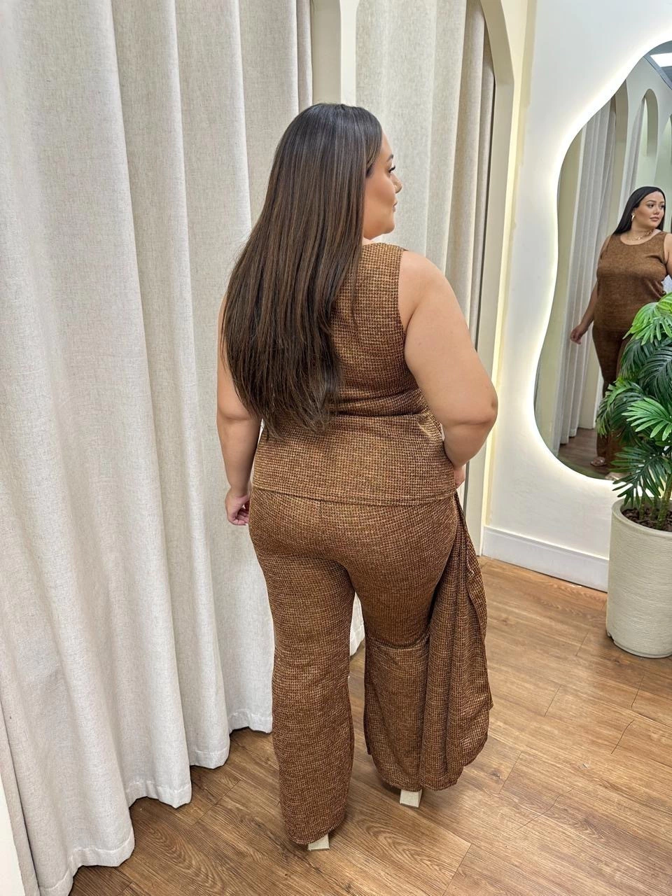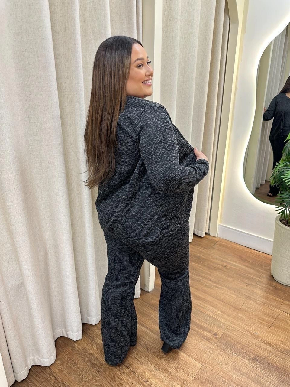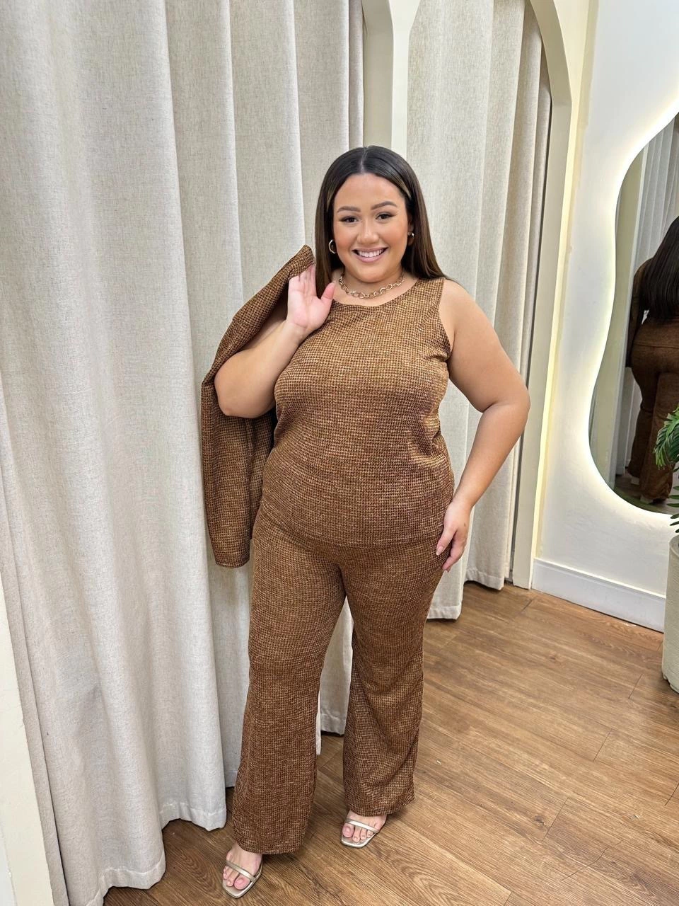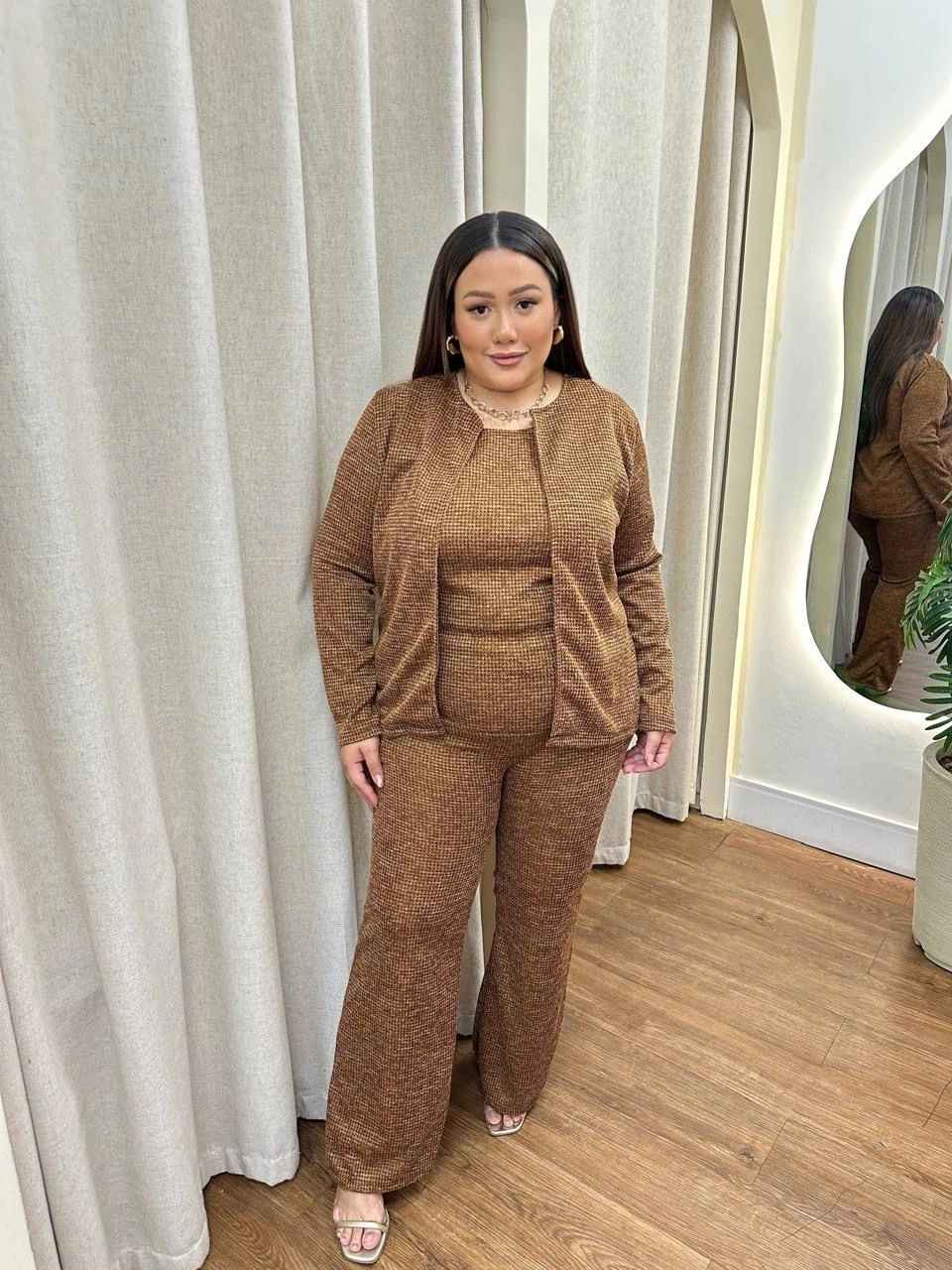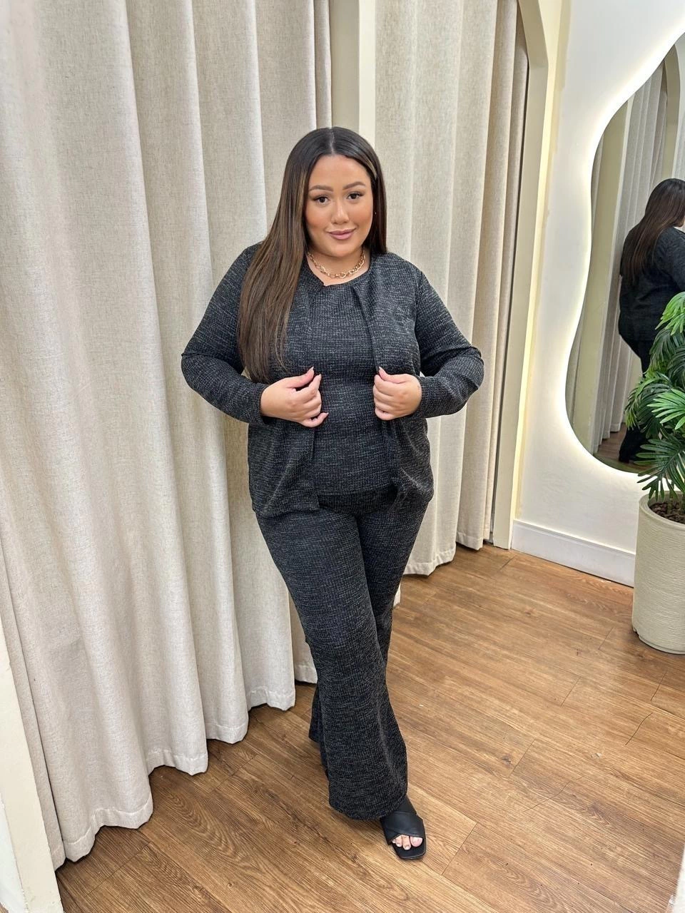 Conjunto de 3 peças (Blusa, Calça e Casaquinho), Blusa de alça grossa, casaco de manga longa e calça com elástico na cintura.
