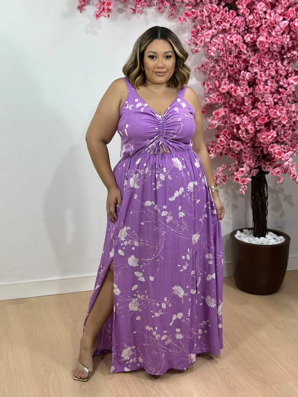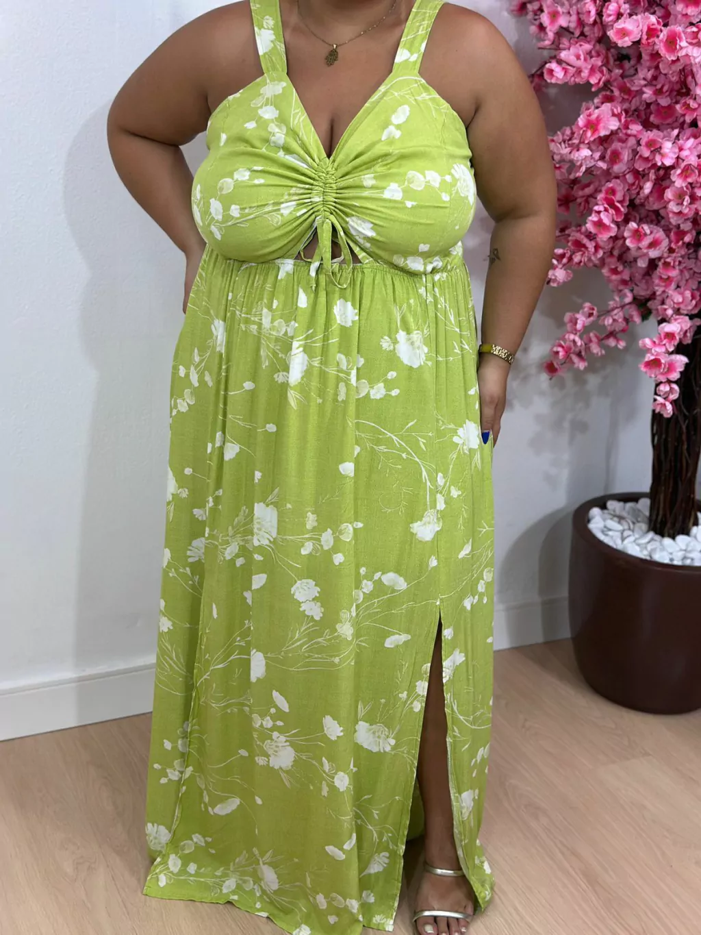 Vestido longo com detalhe de ajuste e amarração no busto, lastex nas costas, alça grossa.