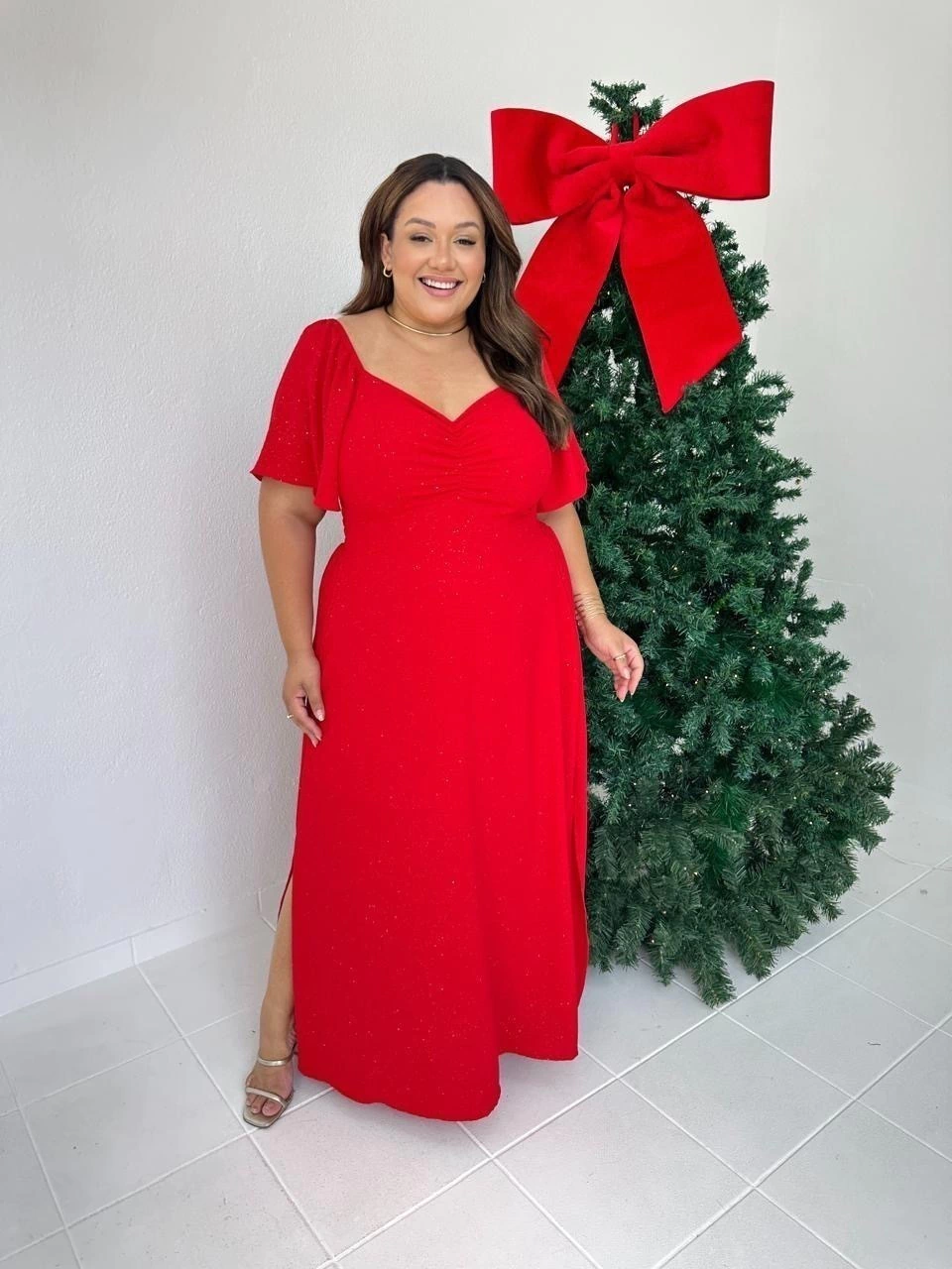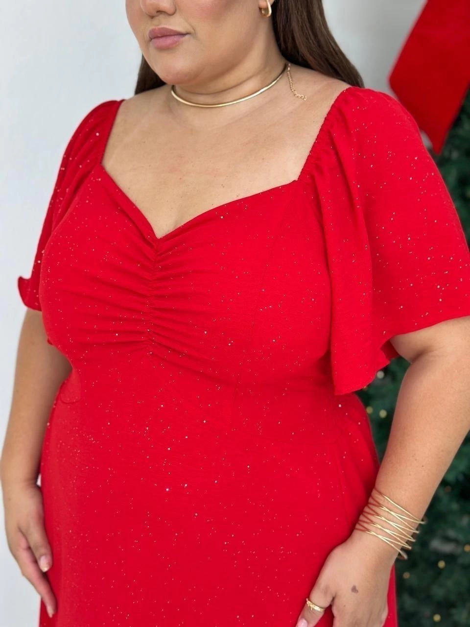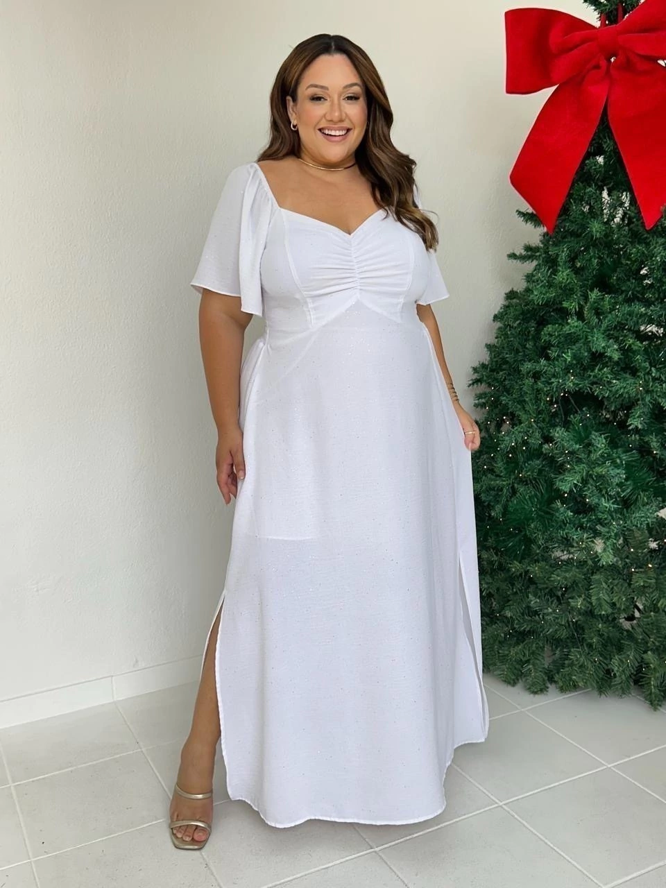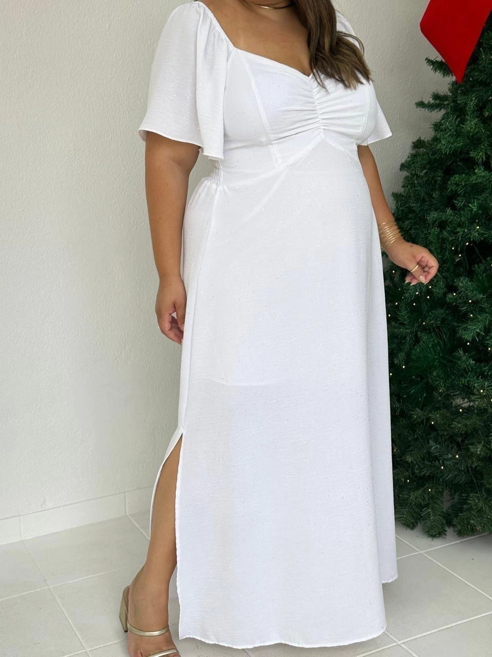 Vestido de manga curta com detalhe drapeado no busto, lastex nas costas, modelo fluido. Possui detalhes de brilho prata em todo vestido.