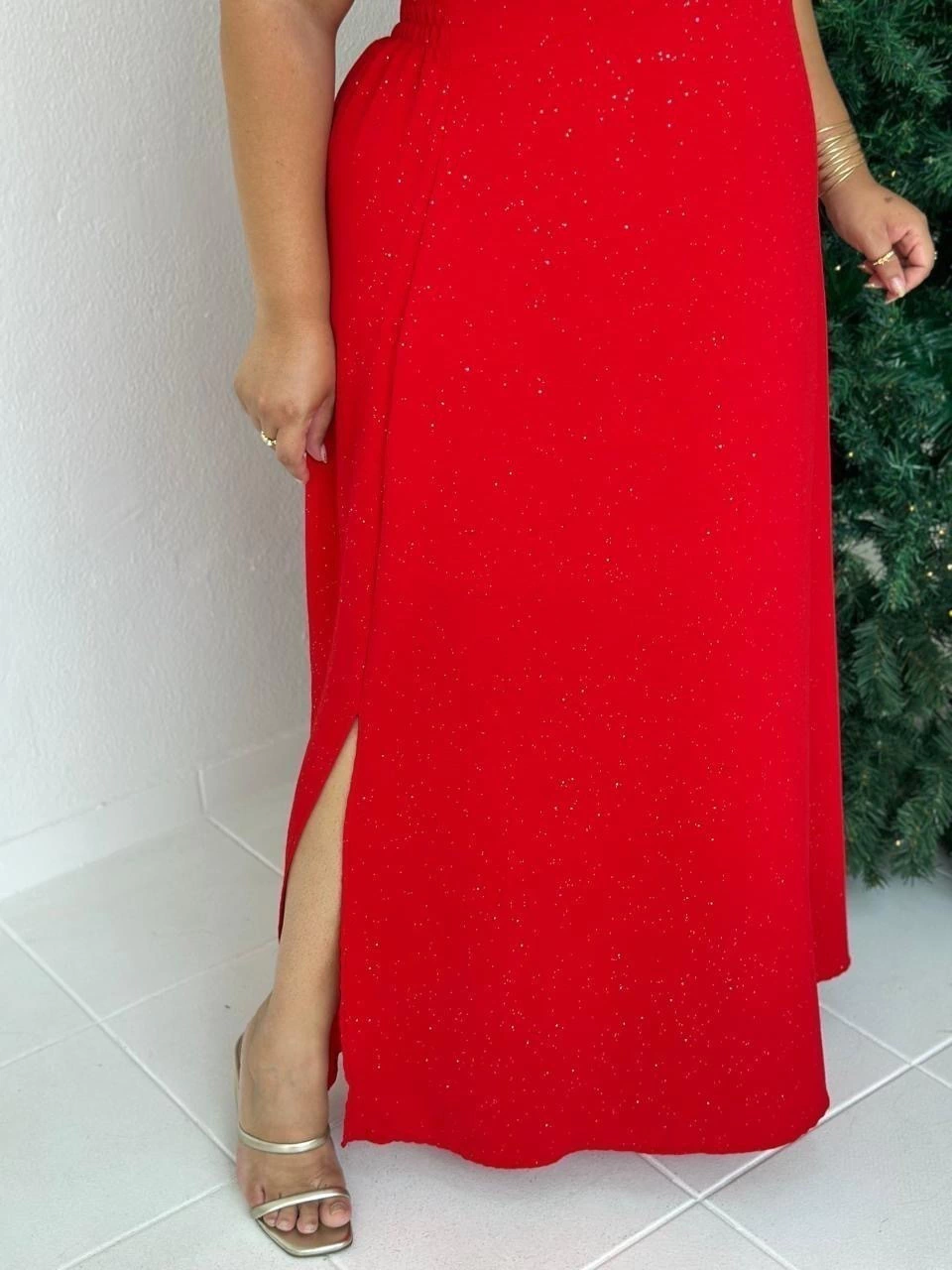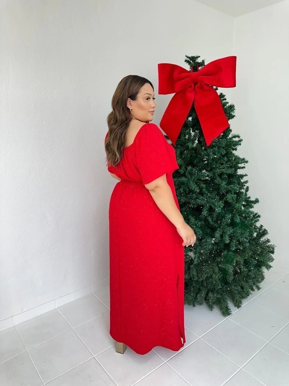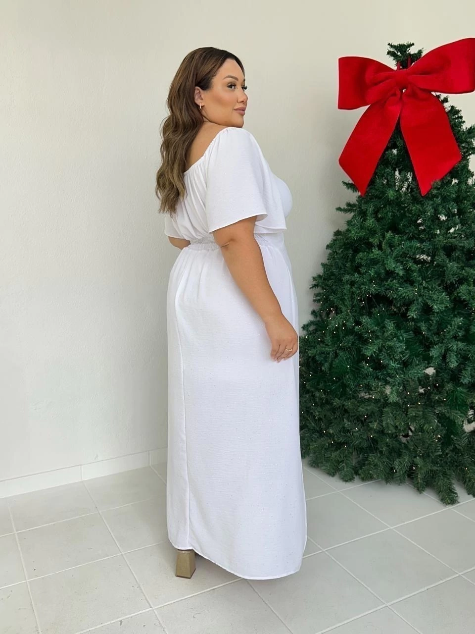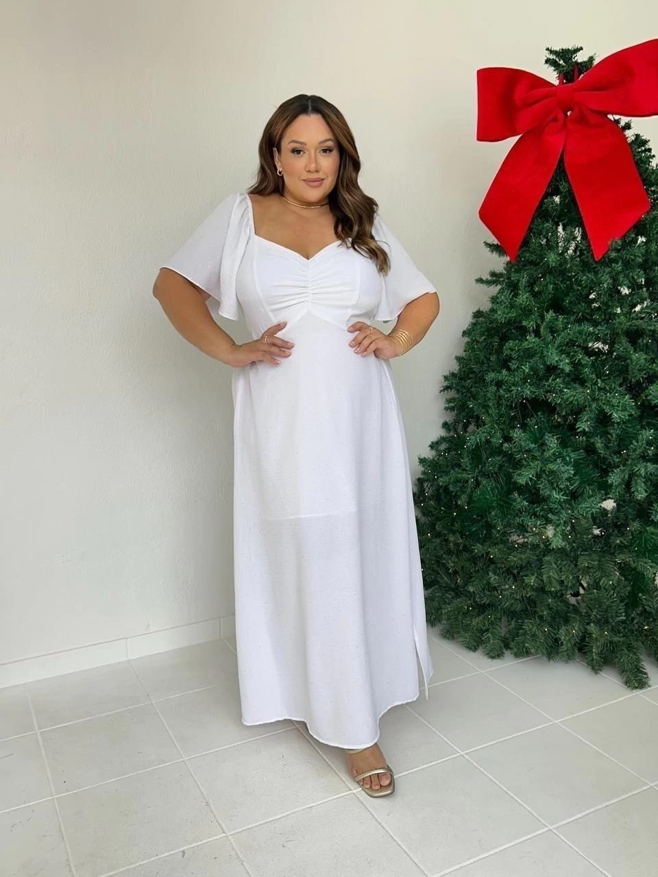 Vestido de manga curta com detalhe drapeado no busto, lastex nas costas, modelo fluido. Possui detalhes de brilho prata em todo vestido.